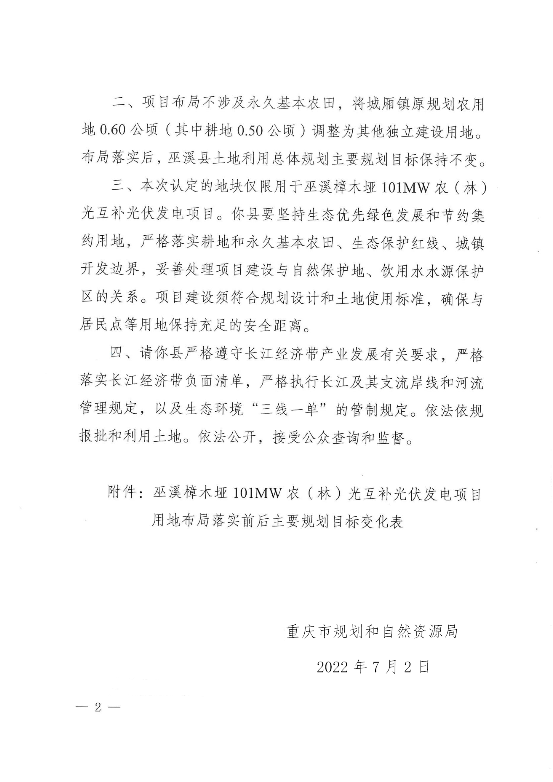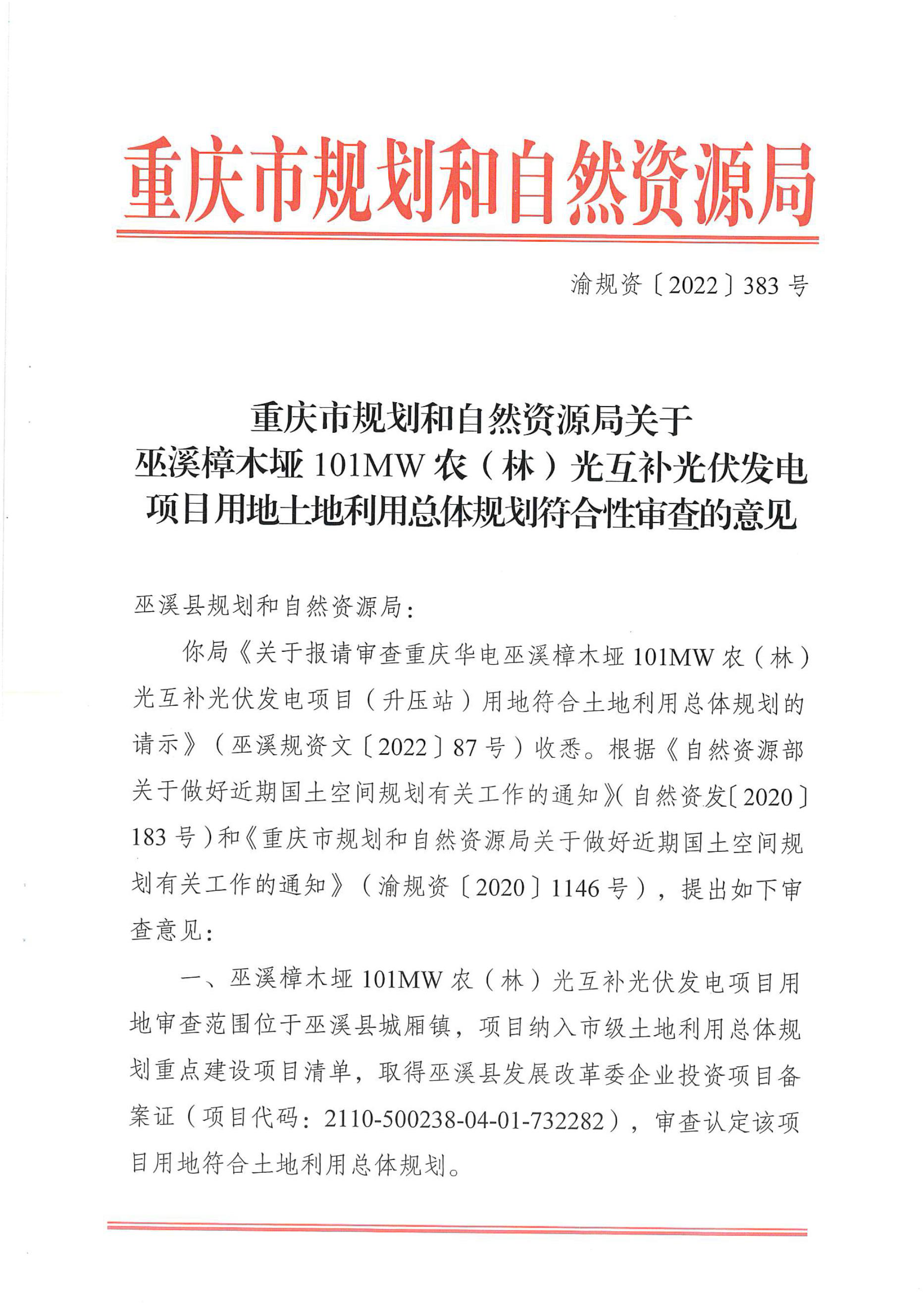 重庆市规划和自然资源局关于巫溪樟木垭101MW农(林)光互补光伏发电项目用地土地利用总体规划符合性审查的意见