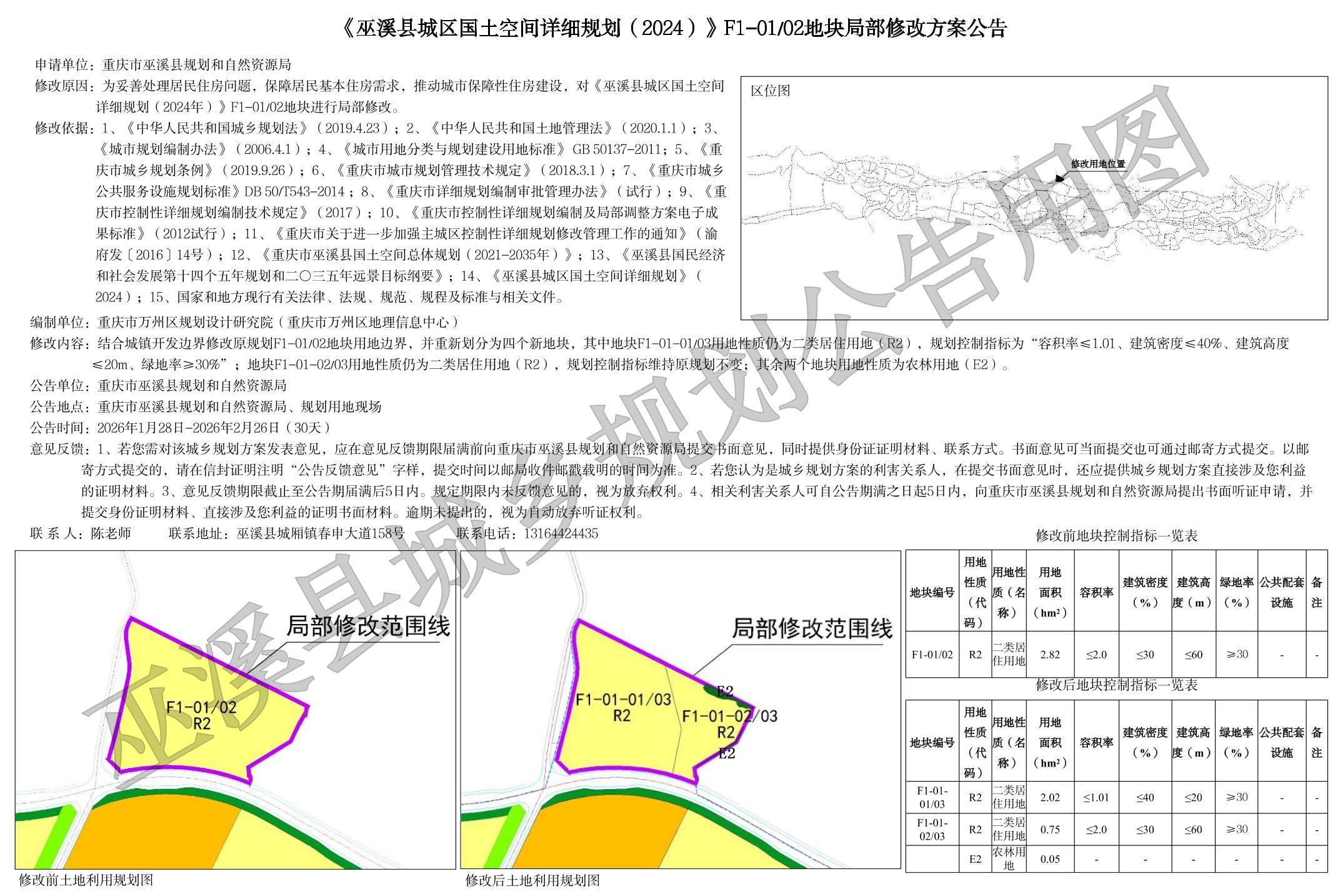 巫溪县通城镇中兴村ZX05-TC-ZX-01/01地块详细规划方案公告、《巫溪县城区国土空间详细规划(2024)》F1-01/02地块局部修改方案公告