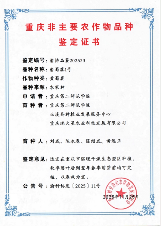 2025年11月,取得渝贝1号、渝蜀葵1号太白贝母、黄蜀葵新品种审定,巫溪县实现中药材新品种审定零突破。