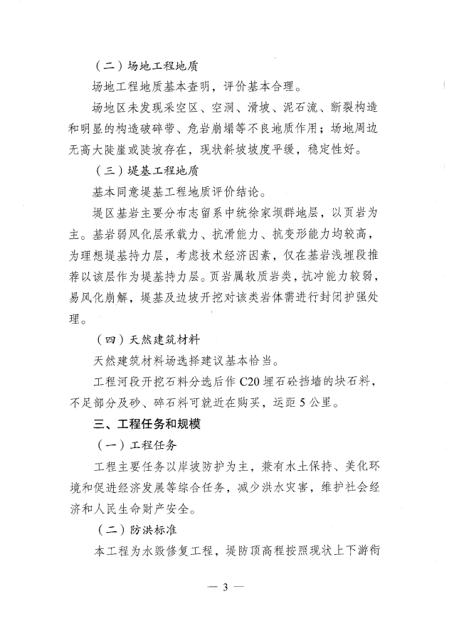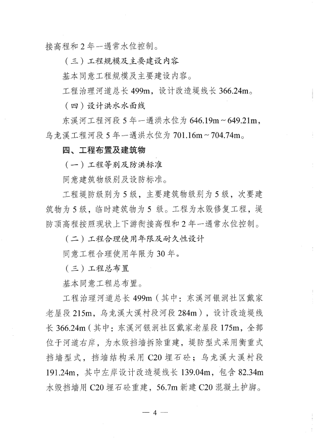 同意建筑物级别和洪水标准,工程堤防级别为5级,主要建筑物级别为5级,次要建筑物为5级,临时建筑物为5 级。工程为水毁修复工程,堤防顶高程按照现状上下游衔接高程和2年一遇常水位控制。同意工程合理使用年限为30年。