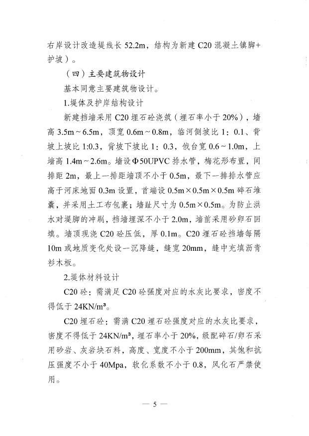 2.堤体材料设计。C20砼:需满足C20砼强度对应的水灰比要求,密度不得低于24KN/m³。C20埋石砼:需满C20埋石砼强度对应的水灰比要求,密度不得低于24KN/m³,埋石率小于20%,级配碎石/卵石采用砂岩、灰岩块石料,高度、宽度不小于200mm,其饱和抗压强度不小于40Mpa,软化系数不小于0.8,风化石严禁使用。碎石堆囊:采用连续级配、耐风化、水稳定性好的砂岩、灰岩料,单轴饱和抗压强度标准值不小于30MPa,粒径5~50mm,含泥量不得高于3%。砂卵石回填:要求石料为抗风化性能好,质地坚硬的灰岩或砂岩;灰岩湿抗压强度不小于40Mpa,软化系数大于0.8,砂岩湿抗压强度不小于20Mpa,软化系数大于0.7;直径0.3m至0.6m。土石碾压回填:采用开挖料或外运料碾压填筑,要求级配良好,压实度不得低于0.91,碾压干密度不小于19.5KN/m3,最大粒径不超过20cm,粒径5mm以下含量不大于25%,填筑时应分层碾压,土石回填体要求C=5kpa,φ=28°。