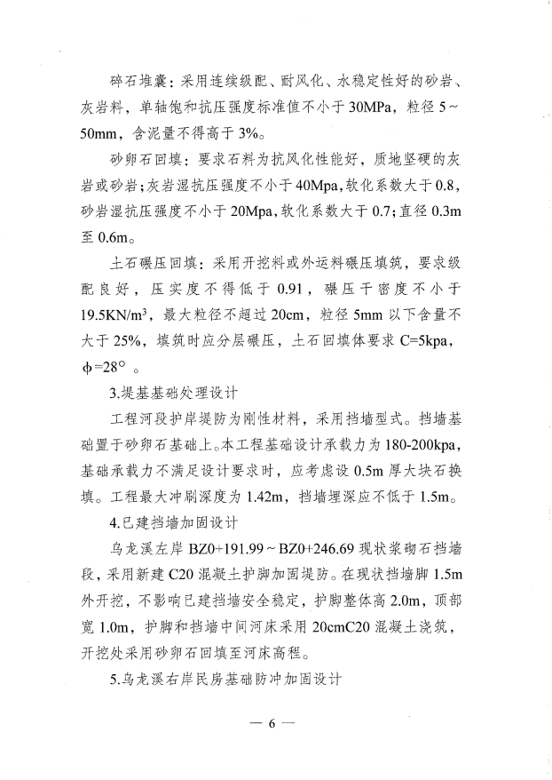 5.乌龙溪右岸民房基础防冲加固设计。乌龙溪右岸BY0+000.00~BY0+052.20段,为保护堤顶房屋基础安全,采用新建C20混凝土镇脚+护坡的形式,对房屋基础进行防冲加固。镇脚宽0.5m,高1.5m,镇脚和房屋基础挡墙之间河床采用20cm厚C20混凝土浇筑护坡,开挖处采用砂卵石回填至河床高程。
