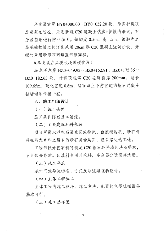 6.乌龙溪左岸现状堤顶硬化设计。乌龙溪左岸BZ0+049.93~BZ0+152.81、BZ0+175.86~BZ0+182.63段,对堤顶现浇C20砼路面厚200mm,总长109.65m,硬化宽度0.6m,路面与上下游重建的埋石混凝土挡墙墙顶衔接平整。