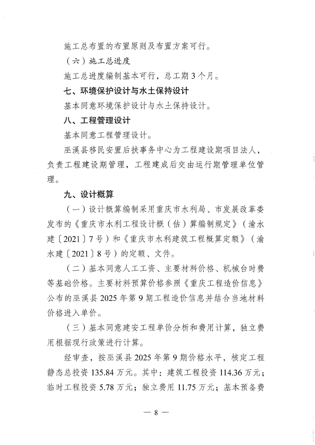 工程静态总投资合计为135.84万元。其中:建筑工程投资114.36万元;临时工程投资5.78万元;独立费用11.75万元;基本预备费3.96万元,最终投资以县发展改革委概算审核批复为准。资金来源为对口支援资金。