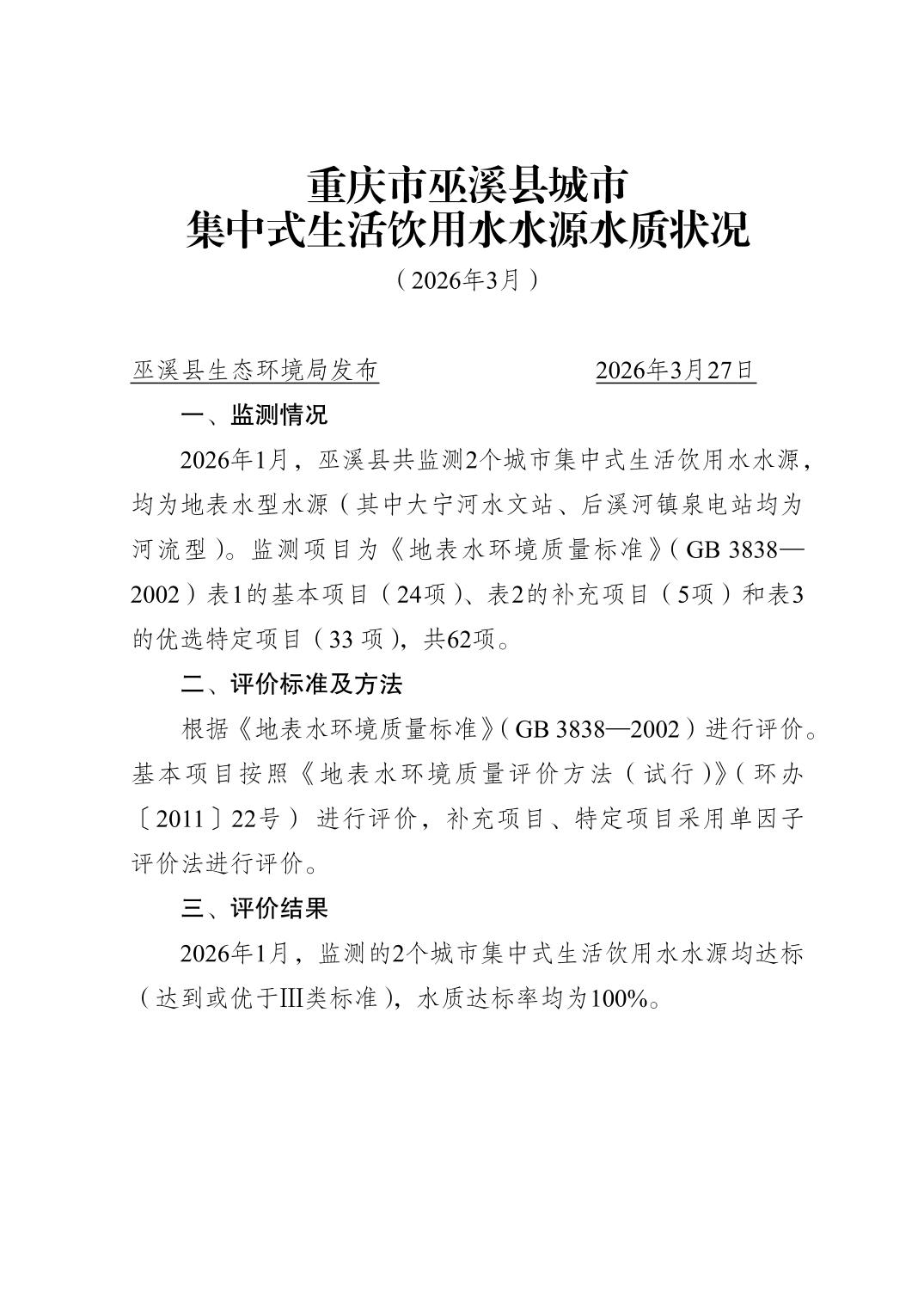 重庆市巫溪县城市集中式生活饮用水水源水质状况 (2026年3月)