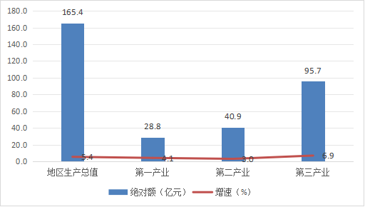 初步核算,2025年,全县实现地区生产总值165.4亿元,按不变价格计算,同比增长5.4%。分产业看,第一产业实现增加值28.8亿元,同比增长4.1%;第二产业实现增加值40.9亿元,同比增长3.0%;第三产业实现增加值95.7亿元,同比增长6.9%。三次产业对经济增长的贡献率分别为15.05%、14.19%、70.76%,分别拉动经济增长0.81、0.77、3.82个百分点,三次产业结构比为17.4:24.7:57.9。