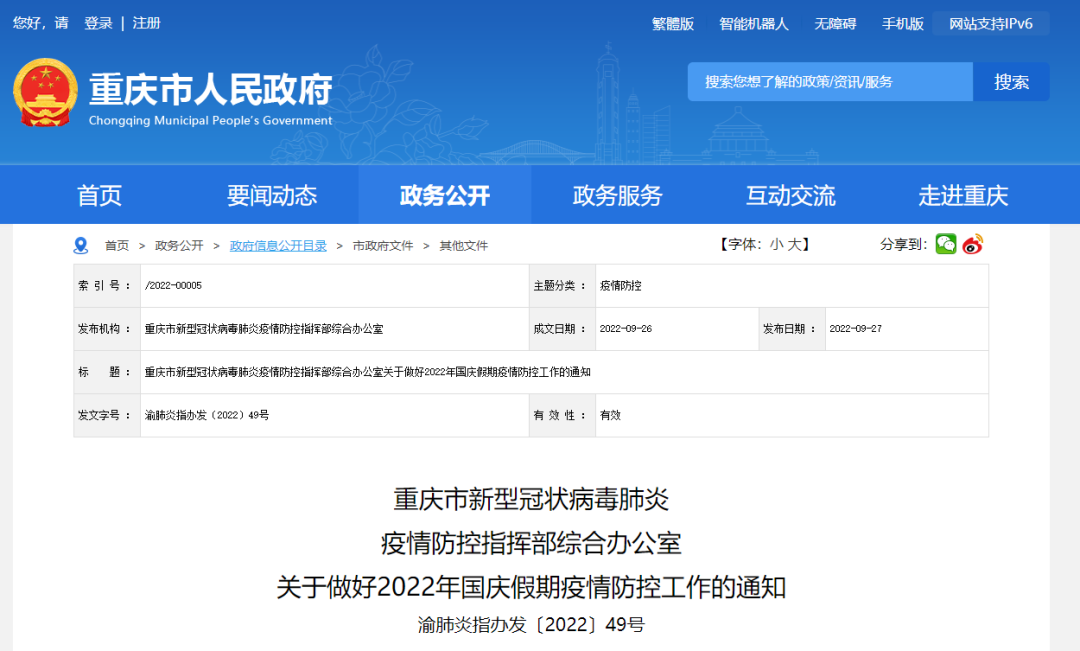 9月27日, 重庆市新型冠状病毒肺炎疫情防控指挥部综合办公室发布《关于做好2022年国庆假期疫情防控工作的通知》。具体如下↓↓↓