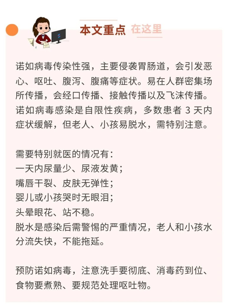 诺如病毒感染是自限性疾病,多数患者 3 天内症状缓解,但老人、小孩易脱水,需特别注意。