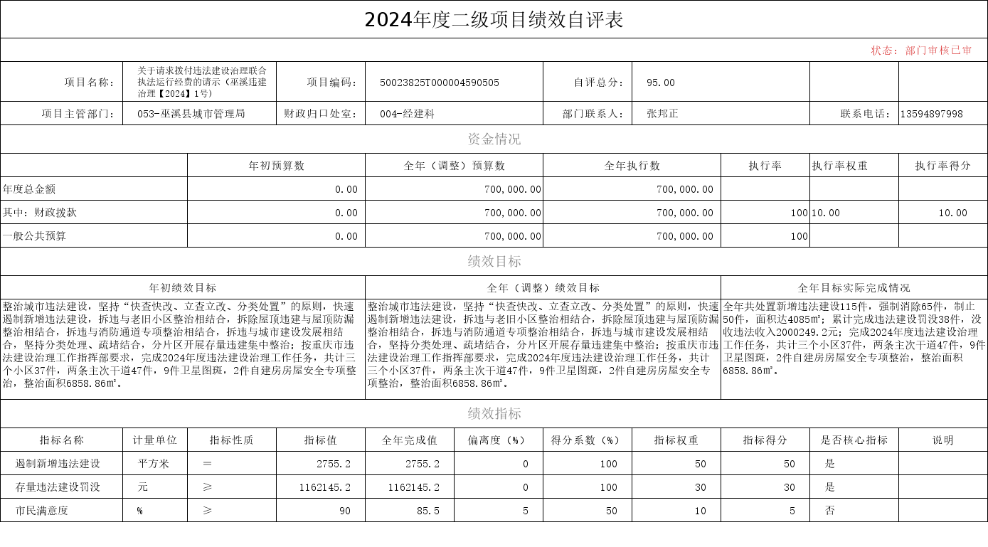 附件:1.2024年度二级项目绩效自评表(关于请求拨付违法建设治理联合执法运行经费的请示(巫溪违建治理【2024】1号)〕