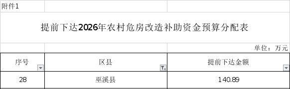 根据《重庆市财政局关于提前下达2026 年农村危房改造补助资金预算的通知》(渝财建〔2025〕217 号)要求,现将2026年农村危房改造补助资金预算提前转下达给你们(详见附件 1)。