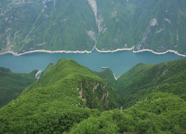 这是一条从高处欣赏巫峡大美风光的线路:盘山公路蜿蜒在1200米海拔之上的山峰之巅,俯瞰下去,高山如同神斧劈成的绝壁,垂直到峡谷深处,深谷中的江水碧绿连天,大型游船、万吨巨轮就如同小舟在行驶。