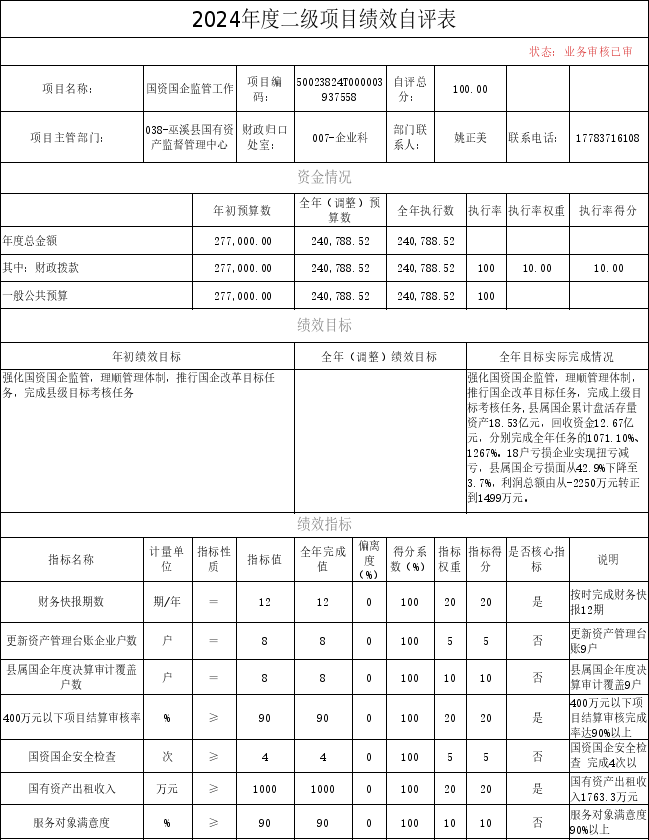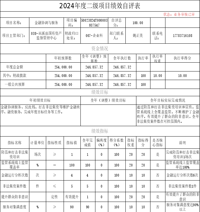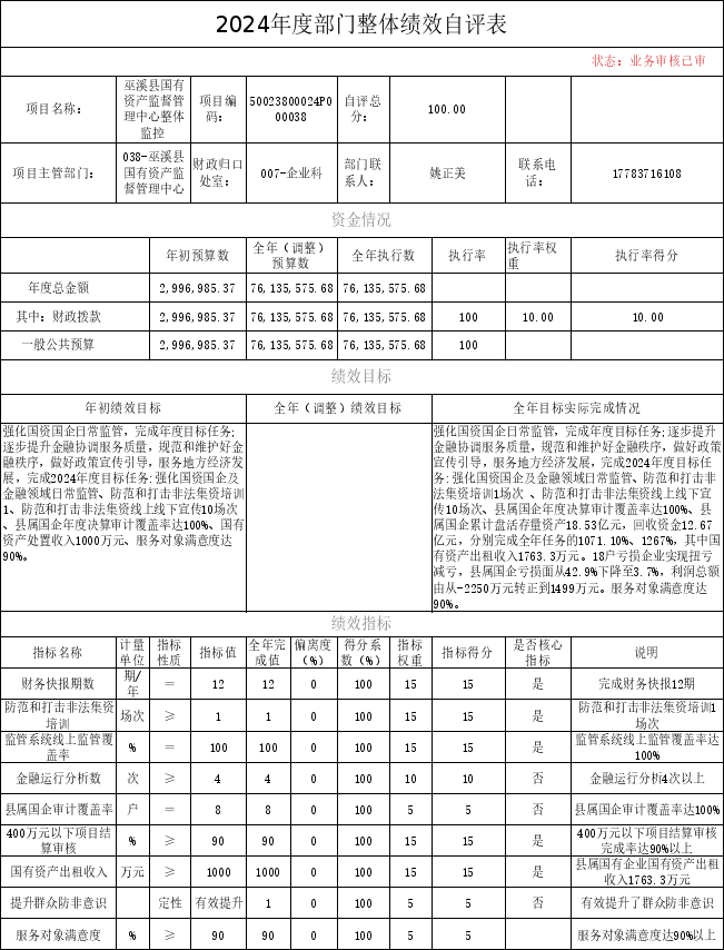 我中心对2022-2023年其他服务业升规升限补助、财务补助、金融协调与服务、国资国企监管工作、2024年物流园区至通城片区乡村振兴提升工程(溪财发【2024】129号)、巫溪县2024年度易地扶贫搬迁贷款贴息、巫溪县工业园区农产品流通中心及配套基础设施项目等8个项目开展了绩效评价,涉及财政拨款项目资金7367.24万元,评价得分100分,评价等次为良。