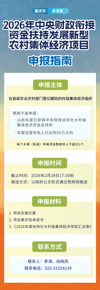 【申报指南】巫溪县2026年中央财政衔接资金扶持发展新型农村集体经济项目申报指南