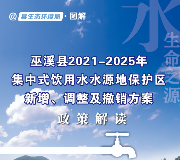 市政府批准同意我县新增、调整及撤销部分集中式饮用水水源地保护区。按照《重庆市生态环境局关于公布实施万州区等区县(自治县)集中式饮用水水源地保护区的函》(渝环函〔2021〕394号)、《重庆市生态环境局关于公布实施渝北区等区县集中式饮用水水源地保护区的函》(渝环函〔2022〕370号)、《重庆市生态环境局关于公布实施潼南区等区县集中式饮用水水源地保护区的函》(渝环函〔2023〕75号)、《重庆市生态环境局关于公布实施万州等区县集中式饮用水水源地保护区的函》(渝环函〔2024〕285号)和《重庆市生态环境局关于公布实施万州等区县集中式饮用水水源地保护区的函》(渝环函〔2025〕27号)等文件相关要求,现将《巫溪县2021—2025年集中式饮用水水源地保护区新增、调整及撤销方案》公布实施。请各单位按照《中华人民共和国水污染防治法》《重庆市水污染防治条例》等法律法规要求抓好饮用水水源地保护工作,切实保障群众饮水安全。