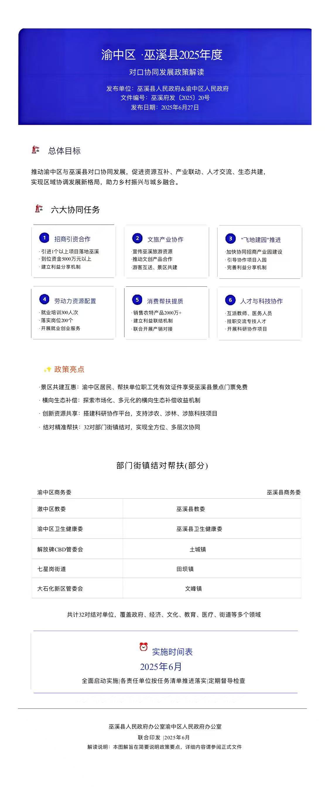 现将《渝中区·巫溪县2025年度对口协同发展任务清单》《渝中区·巫溪县2025年度部门街镇结对帮扶表》印发给你们,请各责任单位、结对单位加强对接,认真抓好落实。