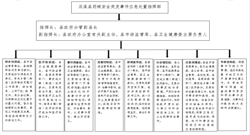 2.1.1 较大、一般药械安全突发事件发生后,县市场监管局报请县政府启动应急预案,在县委、县政府的统一领导下,成立县药械安全突发事件应急处置指挥部(以下简称县指挥部)。县指挥部实行指挥长负责制,由指挥长、副指挥长、成员组成。指挥长由分管药品安全的县政府副县长担任,副指挥长由县政府办公有关副主任以及县市场监管局、县卫生健康委主要负责人担任,县级有关部门、有关单位和事发地乡镇(街道)有关负责人为成员。重大、特别重大药械安全突发事件发生后,县委、县政府在市药械安全突发事件应急处置指挥部的指导下开展先期处置工作。县指挥部组成及职责见附件1。