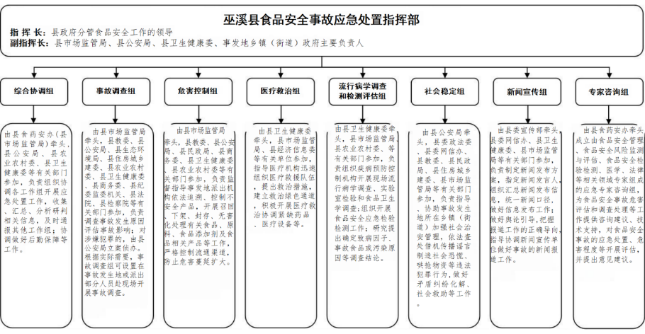 在县委、县政府统一领导下,成立巫溪县食品安全事故应急处置指挥部(以下简称县指挥部)。县指挥部实行指挥长负责制,由县政府分管食品安全工作的领导任指挥长,县市场监管局、县公安局、县卫生健康委、事发地乡镇(街道)政府主要负责人任副指挥长,县级有关部门、有关单位负责人为成员,负责组织、指挥、协调负责辖区内较大、一般食品安全事故的应对处置工作,参与特别重大、重大食品安全事故的应对处置工作,传达贯彻执行党中央、国务院有关决策部署和市委、市政府,县委、县政府有关工作要求,向县委、县政府和市食药安办报告事故情况及应急处置工作进展情况,组织调度有关队伍、专家赶赴现场参加应急处置,决定对事故现场进行封闭和对事故现场周边实行交通管制等强制性措施,发布事故有关信息,组织指导有关小组各司其职开展应急处置、调查等各项工作。县指挥部成员单位职责见附件9.2。