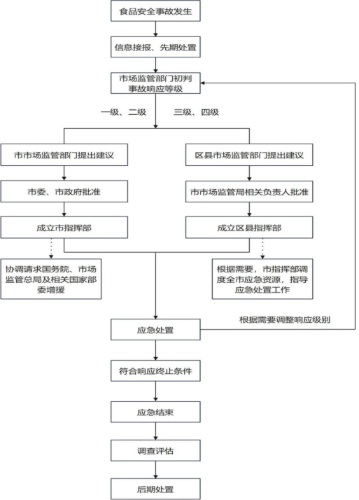 在二级应急响应措施基础上,进一步采取以下措施: 市指挥部立即向国务院、国家市场监管总局和市委、市政府报告事故信息,在国家食品安全事故应急处置指挥部及其工作组的统一指挥下,组织协调有关部门全力开展应急处置,并及时报告处置进展情况。 |