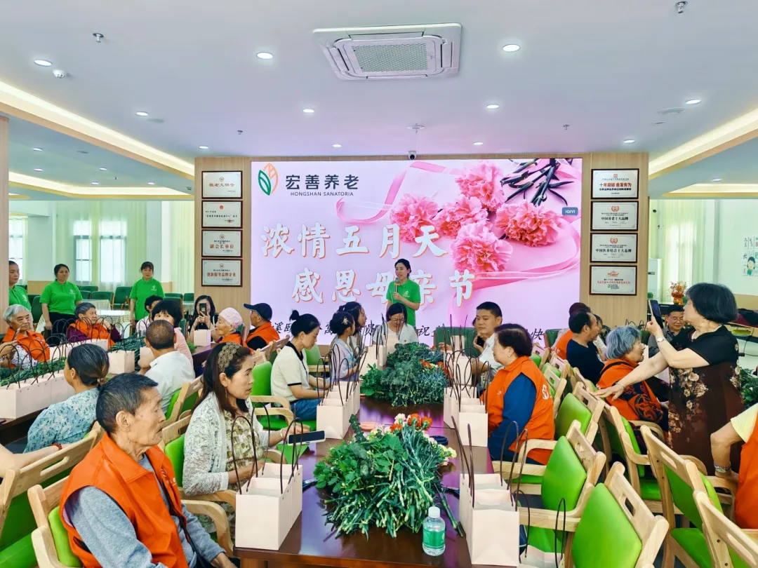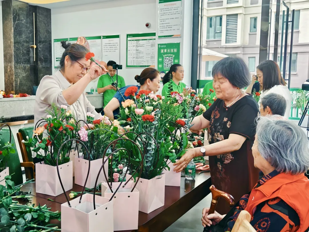 在宏善养老禾溪颐年公寓大厅,一场以“浓情五月天,感恩母亲节”为主题的插花沙龙活动温馨开展,现场精心准备了鲜花、篮子、剪刀、插花泥等插花所需要的物品以及饮料、瓜果、零食等。活动伊始,工作人员为在场的母亲们献上了手语舞《妈妈我爱你》,随后在工作人员的耐心指导下,大家充分发挥自己的创意和想象力,认真剪枝、插花和整理花叶,一束束层次分明、错落有致的作品在大家的巧手中绽放。期间,子女们纷纷说出自己的肺腑之言,并在便利贴上写下寄语,承载着对母亲无尽的感激和祝福。活动结束后,大家手捧着自己创作的作品,纷纷合影留念,留下了一个个难忘的瞬间。