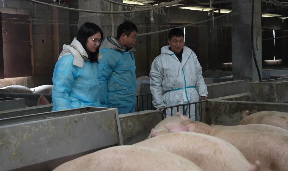 镇村工作人员和养猪户查看生猪生长。