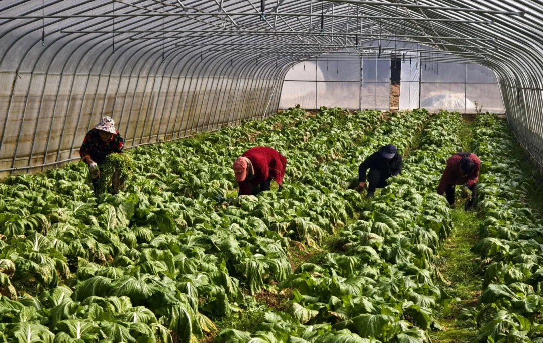 深冬时节,尖山镇大包村的蔬菜种植基地却绿意盎然、生机勃勃。270个标准化大棚整齐排列,包菜、儿菜等各类蔬菜长势喜人,村民们正忙着田间管护,为二月底的集中采收做最后的准备。