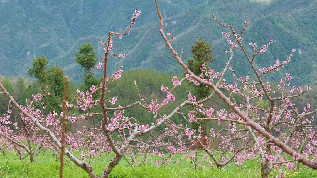 走进乌龙乡的黄桃种植基地,放眼望去,连片的桃林依山势延展,粉色的桃花缀满枝头,微风拂过,花瓣轻轻摇曳,阵阵清甜花香萦绕鼻尖。远远望去,整片桃林宛如粉色云霞笼罩山间,与青山、田园、村落相映成趣。