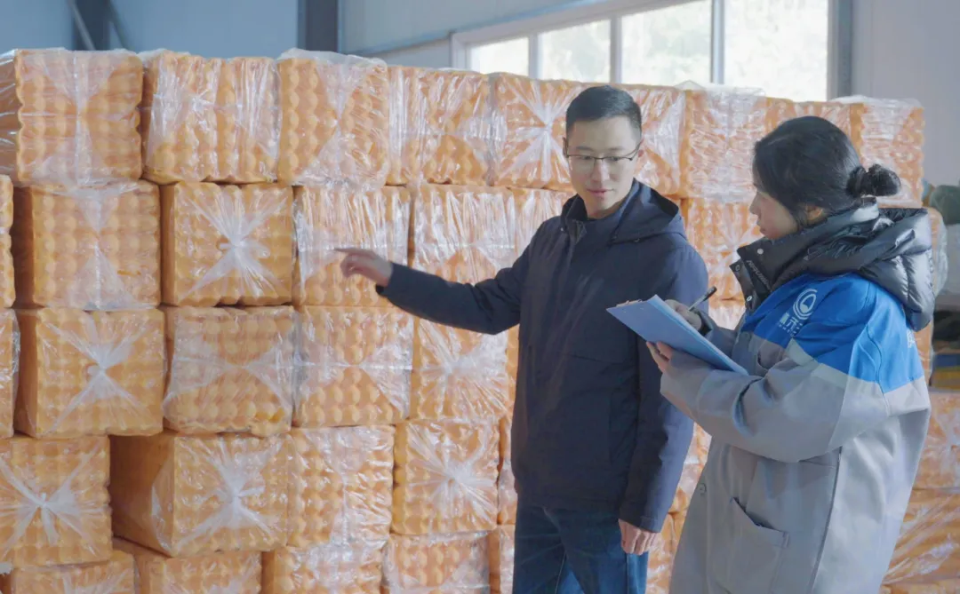 工作人员清点打包鸡蛋,准备出库销售。