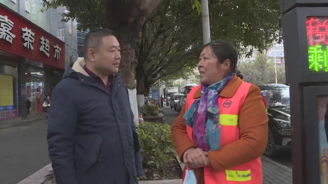 在宁河街道嘉荣百货路段,马丙合与杨永菊亲切交流,仔细询问她的工作、生活情况。