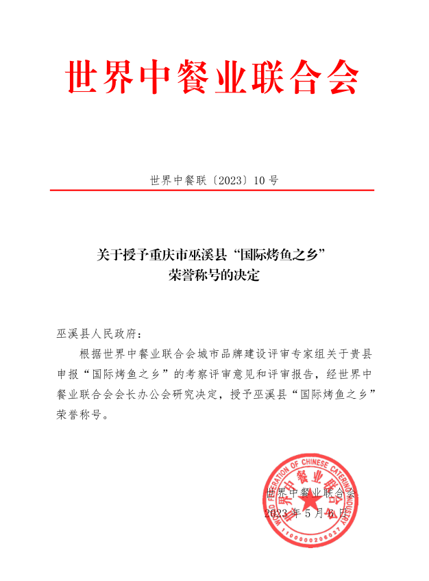 5月7日,记者从巫溪县烤鱼产业发展指挥部获悉,世界中餐业联合会正式授予重庆市巫溪县“国际烤鱼之乡”荣誉称号,拥有2000多年历史的巫溪烤鱼再次受到世界的关注。
