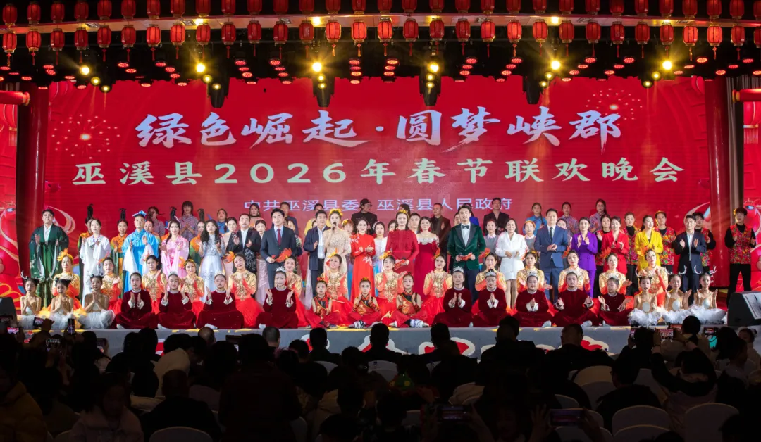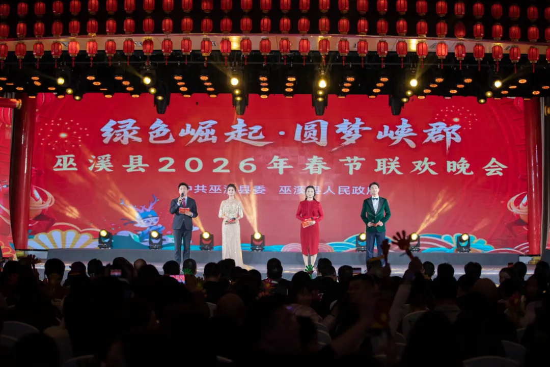 2月11日晚,“绿色崛起 梦圆峡郡”巫溪县2026年春节联欢晚会暨第十五届“文明之光”文艺晚会在县影剧院盛大举行。晚会通过电视及网络平台同步直播,生动展现了巫溪过去一年的发展成就与干部群众昂扬奋进的精神风貌,凝聚起全县上下逐梦新征程、奋进“十五五”的磅礴力量。县委常委夏朝华、肖飞、唐江洪、马丙合、胡超等县领导与全县各界代表欢聚一堂,共迎新春。