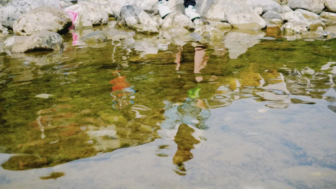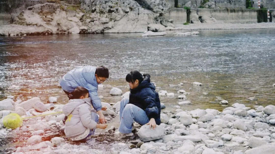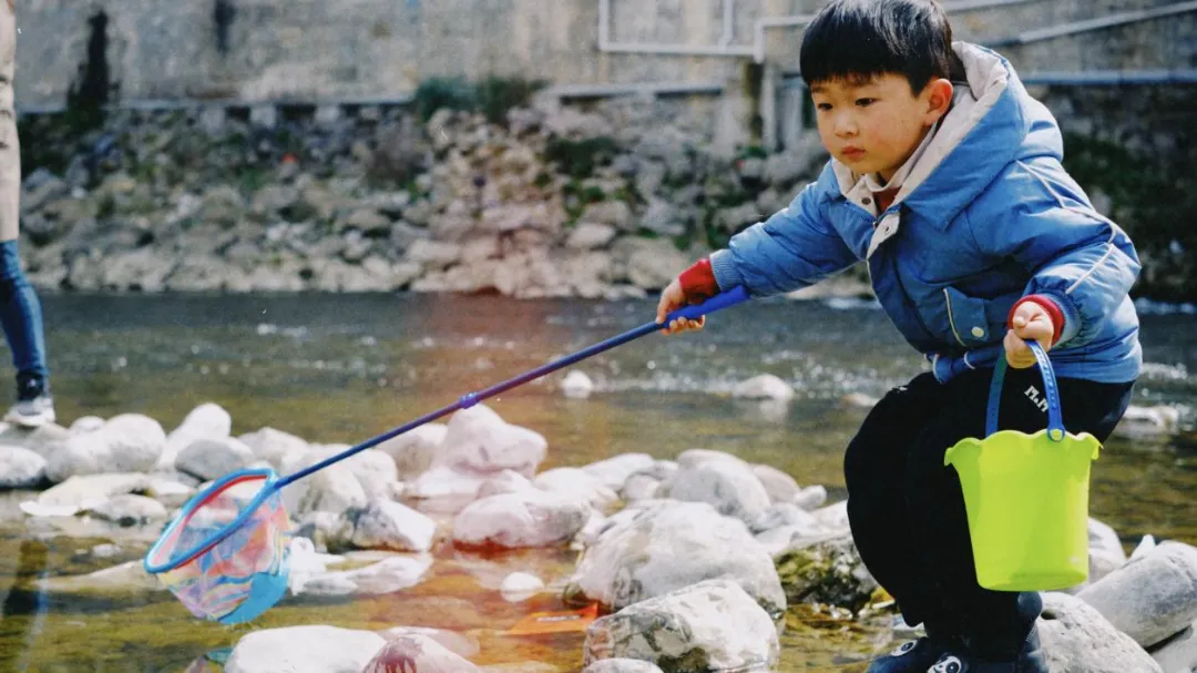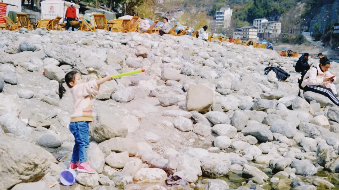 前头的一大一小举起水枪对到河岸就一顿滋,