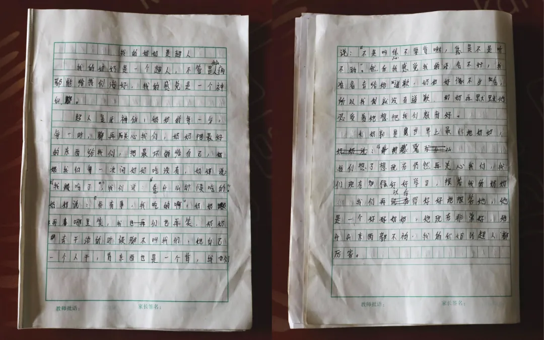 “我的奶奶是个超人,她什么病都能给我们治好。奶奶的每一分、每一时都在关心我们,她把最好的东西给我们,把最坏的东西给自己……我的奶奶比超人都厉害。”暑假期间,即将小升初的学生潘军准备卖掉自己的废旧书本,但他唯一保存了自己11岁时写下的作文《我的奶奶是超人》。潘军轻轻抚平卷角的页边,将作文本小心地塞进柜子里。他知道,那些废旧书本可以卖掉,但这页薄薄的纸,却承载着他永远不愿丢弃的温暖。
