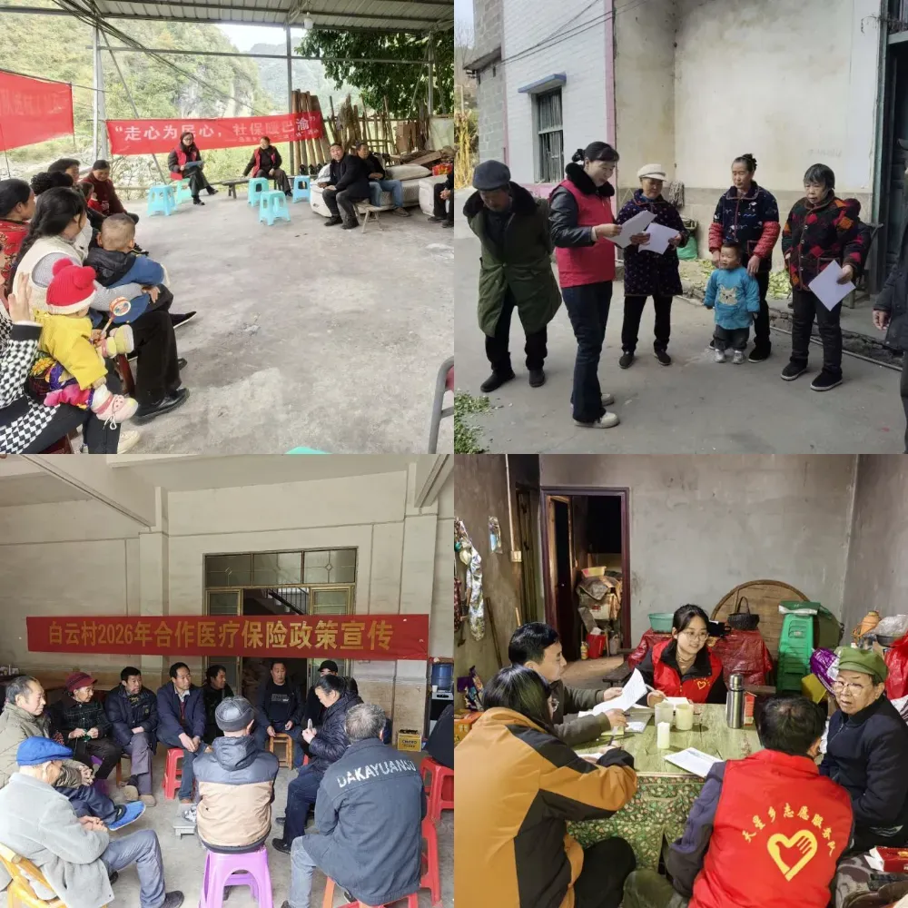 11月12日-11月14日,乌龙乡、菱角镇、天星乡、花台乡、凤凰街道、尖山镇白云村、鱼鳞乡鱼东村新时代文明实践所(站)组织志愿者入户开展2026年度城乡居民医保政策宣传活动。志愿者详细解读参保标准、缴费期,现场答疑门诊报销、大病保险等问题。积极引导村民通过“线上+线下”渠道按时参保。通过分享真实案例,基本医保在抵御疾病风险、减轻医疗负担中的重要作用,有效提升了村民的参保积极性。