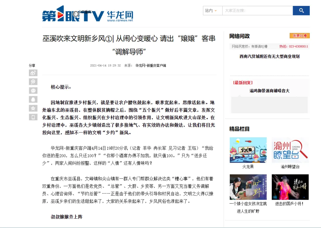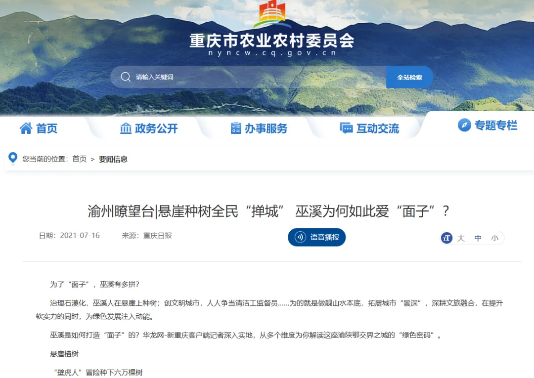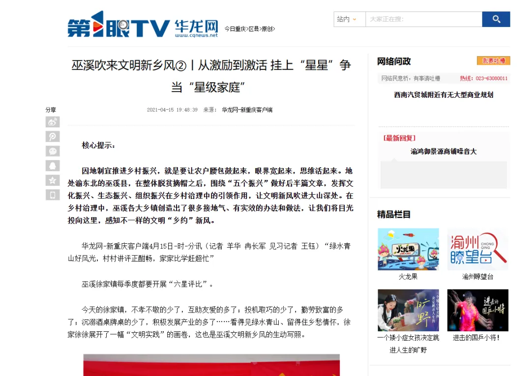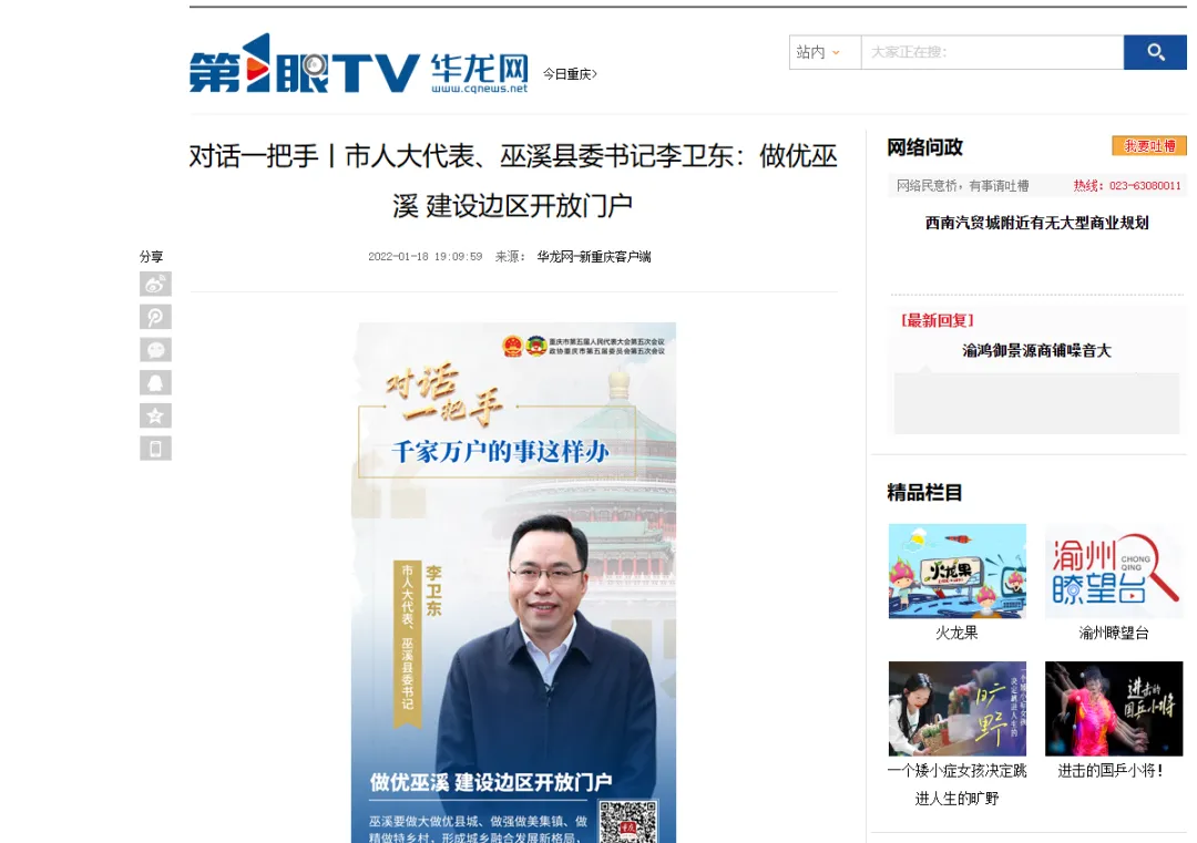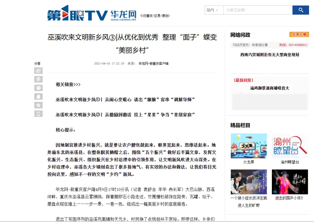 第1眼华龙网平台有关巫溪的深度报道部分截图。
