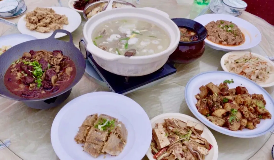 正午时分,随着一声响亮的吆喝,坝坝宴正式拉开帷幕。数十张圆桌整齐排列,村民与游客围坐一桌,其乐融融。鲜香扑鼻的刨猪汤、嫩滑爽口的猪血旺、油润鲜香回锅肉等特色菜肴陆续上桌。大家边吃边聊,现场欢声笑语此起彼伏。