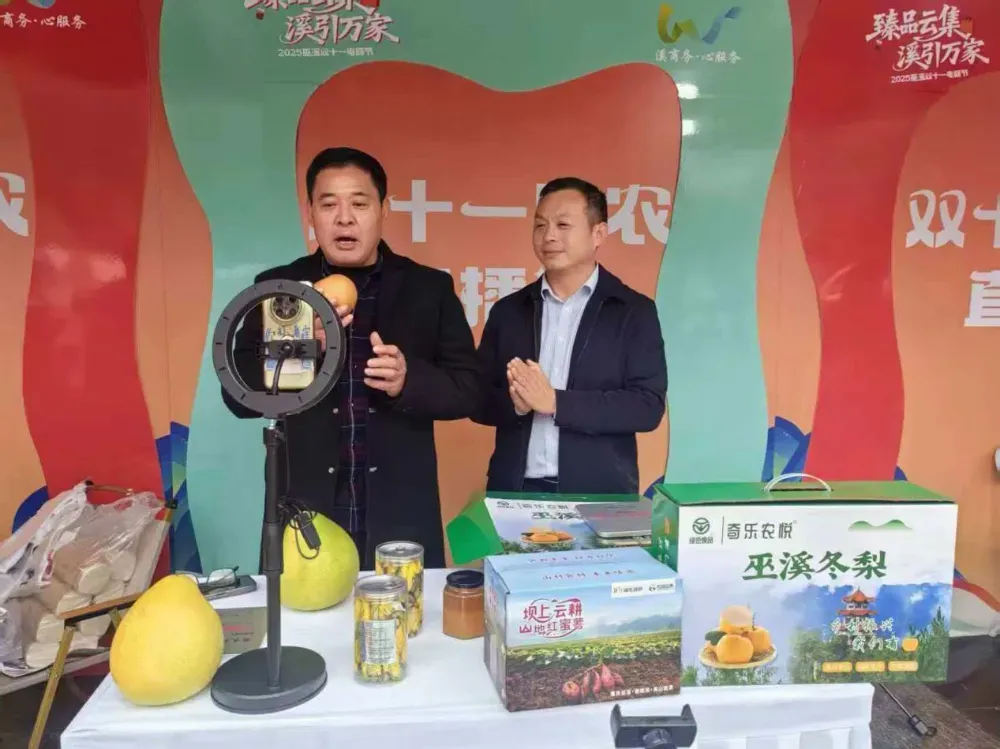 重庆市畜牧科学院派驻云台村第一书记李俊(左)线上推广巫溪冬梨。