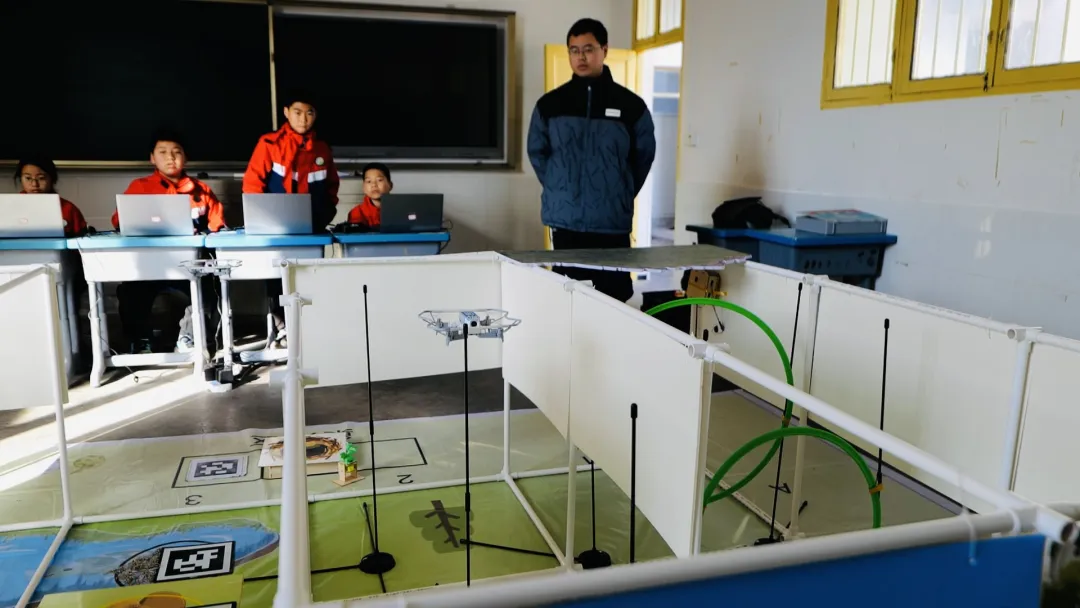 水泥地是他们的停机坪,四张课桌围出起降区,旧纸箱叠成障碍物......没有专业设备、没有模拟场地,一群山区的孩子用代码对话天空,在水泥地上反复试飞、失败、重来。从零起步到自如操控,他们手中的无人机划出的不仅是航线,更是一条靠近梦想的轨迹。