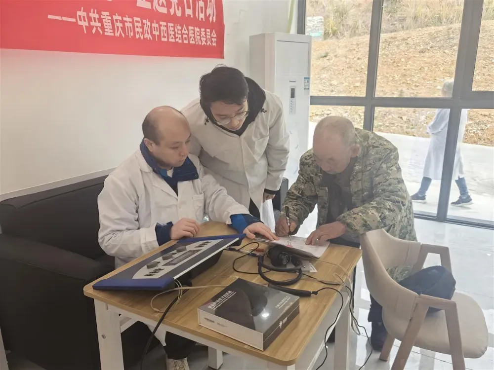 市民政局派驻第一书记郭大亮链接市民政局中西医结合医院为村民进行听力检查。