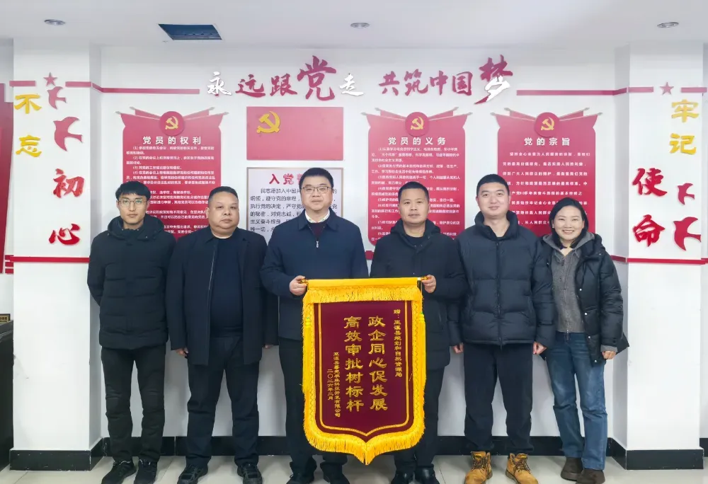 近日,薯光公司一行向县规资局送上 “政企同心促发展,高效审批树标杆” 锦旗,致谢其为巫溪县标准化屠宰场及肉制品加工项目提供的优质审批服务。