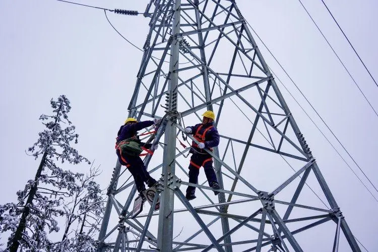 重庆市丰都县仙女湖镇硝厂沟村,国网丰都供电公司输变电中心输电运维检修班电力工人对110千伏坝丰线开展特巡特护,掌握覆冰情况,消除潜在隐患。