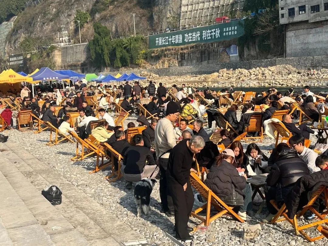 春节期间,最能代表巫溪“烟火气”的非大宁古城莫属。新春时节天气晴好,暖阳高照,大宁古城游人如织,漫滩路烤鱼街人气格外旺盛。古城墙下,大红灯笼高高挂起,年味十足。烤鱼生意十分火爆,游客们三五成群,或闲坐河滩边沐浴暖阳,或漫步青石板路悠然自得。河滩边的靠椅座无虚席,人们一边品尝巫溪老鹰茶,一边享受冬日暖阳,好不惬意。