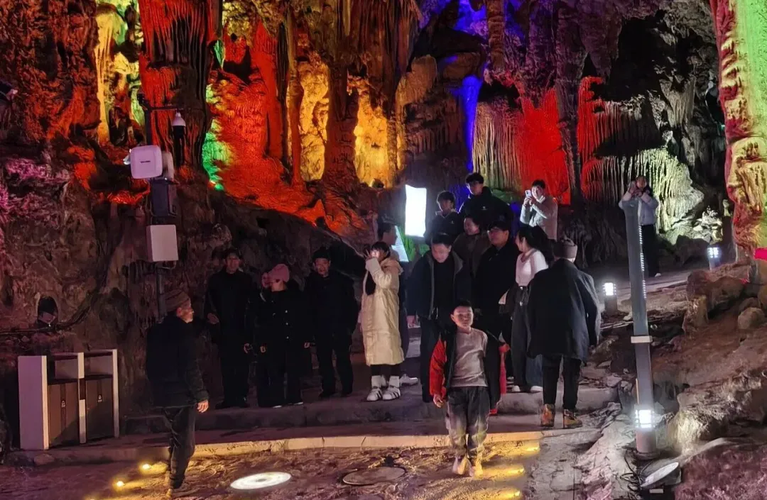 灵巫洞景区游人如织,奇幻溶洞景观与节日氛围相融,让探秘之旅更添喜庆。