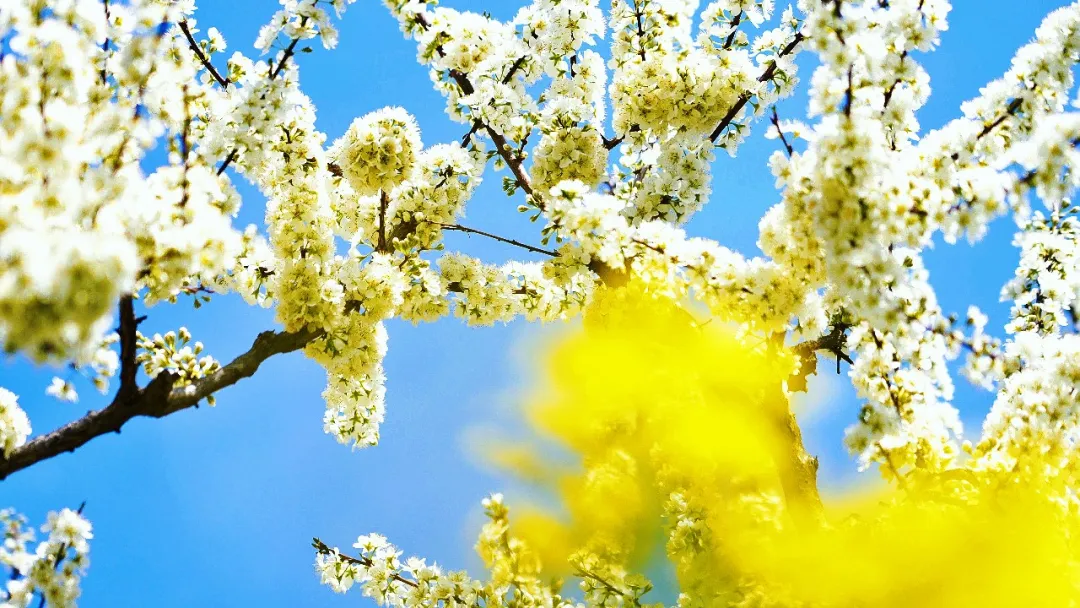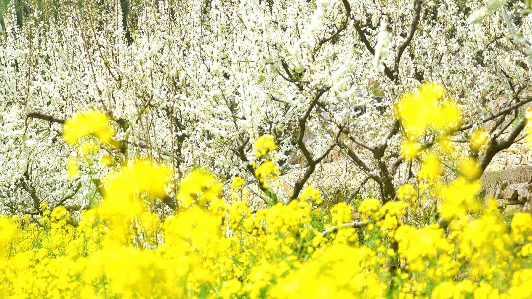 洁白的李花与金黄的油菜花高低相间、交相辉映,色彩明快而饱满,在蓝天白云的映衬下,构成了一幅动人的春日画卷。