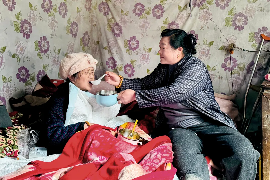 晨曦微露,山雾初散,下堡镇下堡村的一间平房里,58岁的张富美早已开始忙碌。阳光透过木窗,落在她微驼的背上,她熟练地为瘫痪在床的婆婆李良美翻身、擦洗、更换尿布。日复一日的细致照料,早已融进她大半生的寻常日子,成为刻进生命里的习惯。