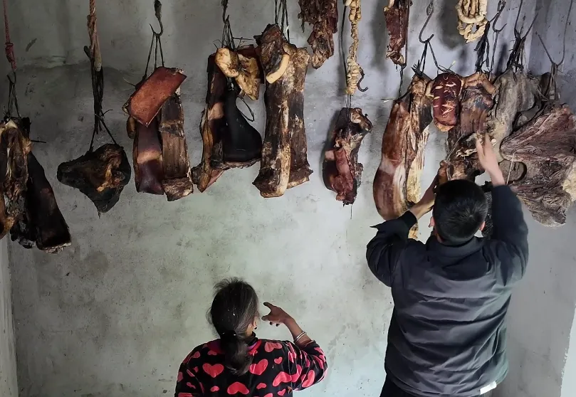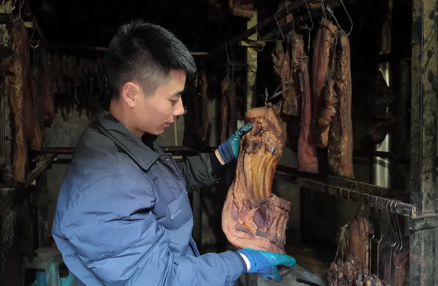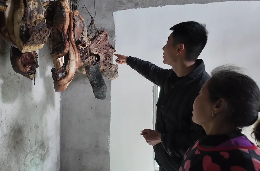 初见张本俊,他正穿梭在村民家中,仔细查验腊肉品质、称重结算,忙碌的身影里满是对这份事业的热忱。