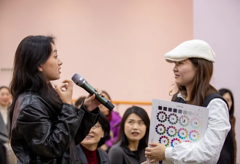 在实操环节,老师还邀请了多位学员上台进行现场示范指导,通过皮肤色彩对比,精准判断每位学员的肤色适配色系,结合身形特点给出针对性穿搭建议,直观展示穿搭改造后的效果,让学员们更清晰地掌握穿搭技巧。
