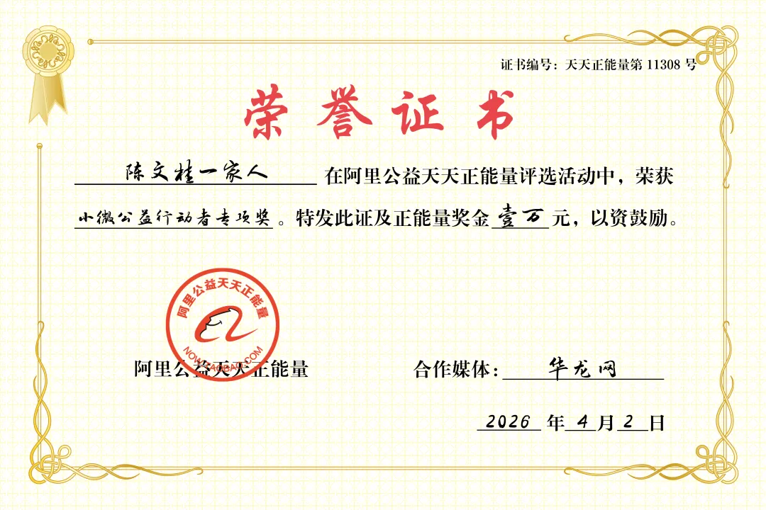 阿里公益天天正能量联合华龙网,授予陈文桂“小微公益行动者专项奖”。