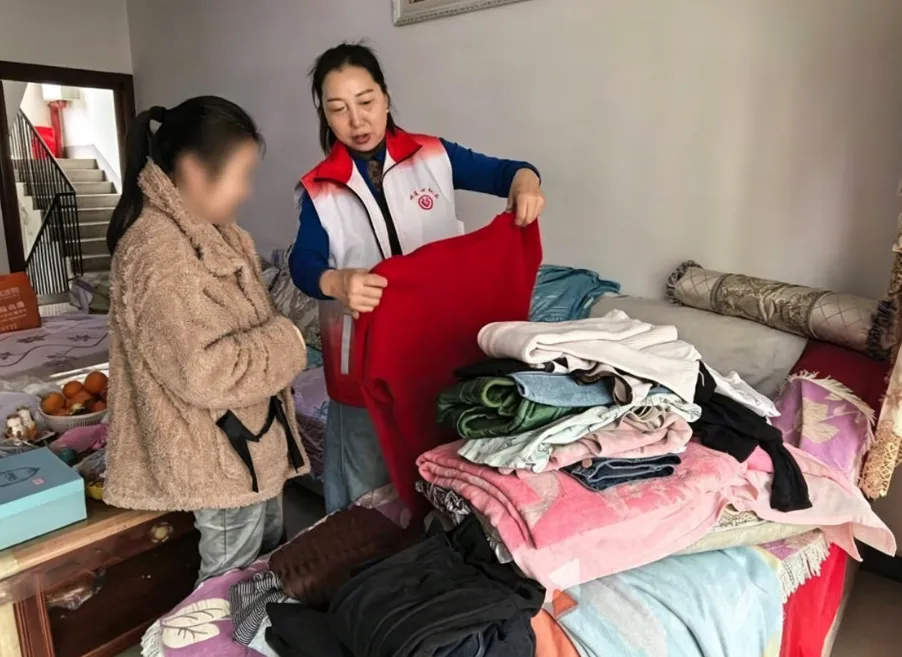 魏成菊站在一旁,虽然看不太清,但一直用手摸着叠得整整齐齐的衣服,嘴里不停地说:“谢谢,谢谢你们。”